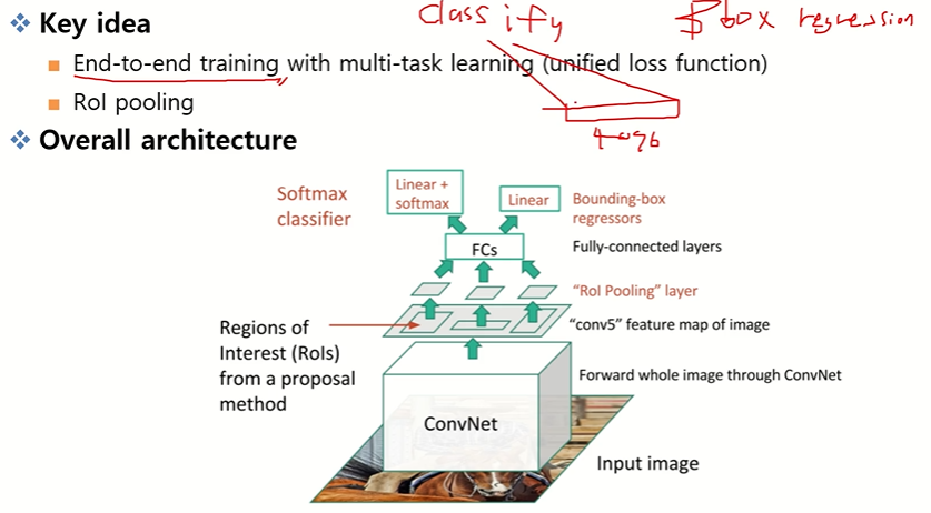 - Classification(Softmax)과 Bounding Box Regression 모두 뉴럴 네트워크로 연결