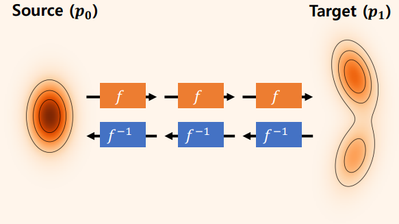 => GAN, VAE 같은 모델은 Source(p0) 분포에서 Target(p1) 분포를 한번에 mapping하는 방식