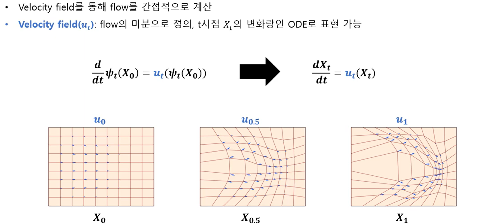 - 한마디로 Velocity Field는 각각의 포인트에서 화살표 방향이다. 어디로 갈지, 즉 각각의 점에서 어디로 움직여야 소스에서 타겟으로 옮겨갈 수 있나를 알려주는것을 Velocity Field라고 한다. ODE로 정의됨