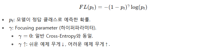 어려운 예제(희소 클래스, 작은 객체)에는 Loss를 집중(focus). - Negative 샘플 억제, Positive 샘플 강조 → Class Imbalance 완화.
