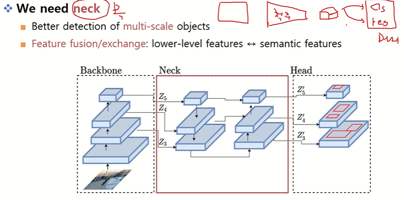 멀티 스케일 객체 검출 성능 개선을 목표로 Backbone(ResNet)과 Head 사이에 Neck = FPN 삽입