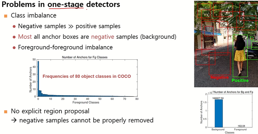 - One-Stage(YOLO, SSD 등): Region Proposal 없음 → Negative(배경) 샘플이 너무 많아 Class Imbalance 발생.