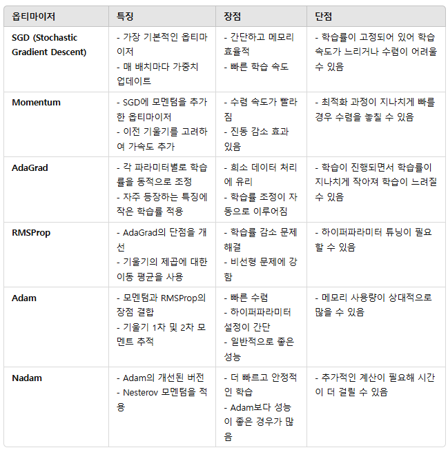 옵티마이저(Optimizer)는 머신러닝과 딥러닝 모델의 학습 과정에서 손실 함수(Loss Function)의 값을 최소화하거나 최대화하는 알고리즘입니다. 옵티마이저는 모델의 가중치(weight)와 편향(bias)를 업데이트하여 모델의 성능을 개선합니다. 이를 통해 더 나은 예측 결과를 얻을 수 있습니다.