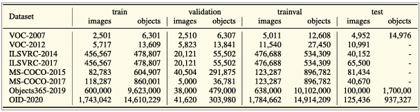 - Open Images Detection 챌린지는 1910,000개의 이미지와 1544,000개의 주석된 바운딩 박스를 제공하며 600개의 객체 카테고리를 다룸.