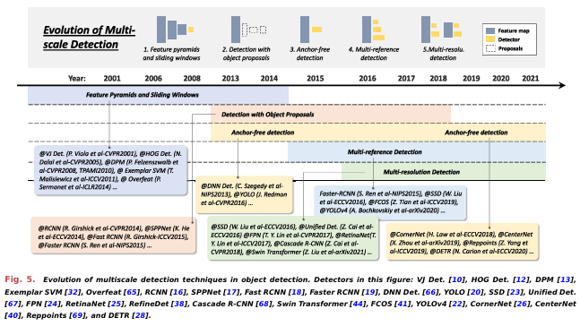 - 다중 스케일 탐지의 기술적 발전 (Technical Evolution of Multiscale Detection): "다른 크기" (different sizes)와 "다른 종횡비" (different aspect ratios)를 가진 객체를 다중 스케일로 탐지하는 것은 객체 탐지의 주요 기술적 도전 과제 중 하나입니다. 지난 20년 동안 다중 스케일 탐지는 여러 역사적인 단계를 거쳐 발전했습니다