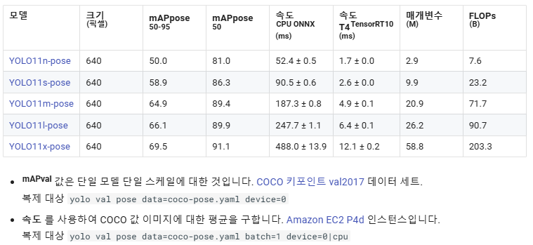 - YOLO("yolo11n-pose.pt"): 훈련된 모델을 가중치를 통해 로드.