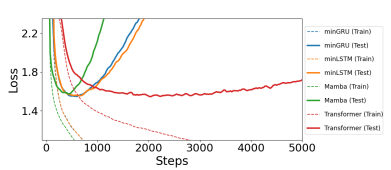 - Shakespeare 데이터셋을 이용한 언어 모델링에서 minLSTM과 minGRU는 Mamba와 Transformer 모델들과 비슷한 성능을 보입니다. 특히 minGRU는 Transformer보다 훈련 속도가 빠르며, Transformer는 minGRU보다 약 2.5배 더 많은 훈련 단계를 필요로 했습니다. minGRU와 minLSTM은 Transformer보다 더 적은 훈련 단계에서 비슷한 성능을 달성합니다 (그림 2).