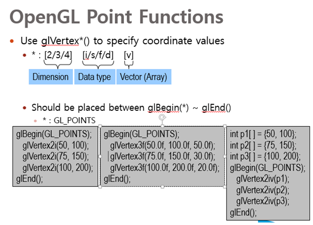 차원, 데이터 타입, 벡터로 구성 / glBegin과 end로 구성