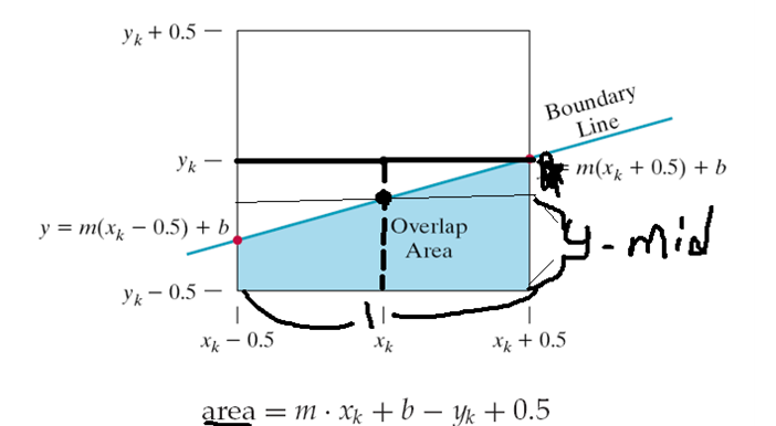 2) 중간점이 실제 선 아래에 있다면 중간점 위에 있는 픽셀 선택