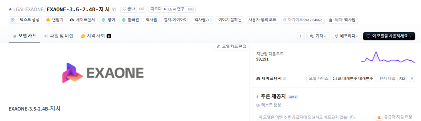 모델 여러 모델을 비교하여 보았지만 가장 빠르고 결과가 나쁘지 않았던 Hugging Face에 공개된 LGAI의 EXAONE-3.5-2.4B-Instruct를 사용하였다.