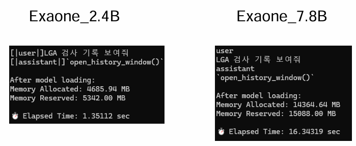Exaone 2.4B 모델과 7.8 모델을 비교해보았는데 CPU 환경이긴 했으나 테스트 결과 속도차이가 조금 있어 2.4B모델로 구성하였다.