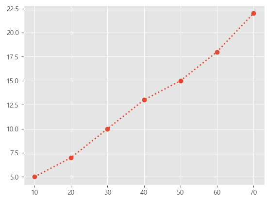 plt.plot(x, y, marker='o', linestyle=':', linewidth=2)