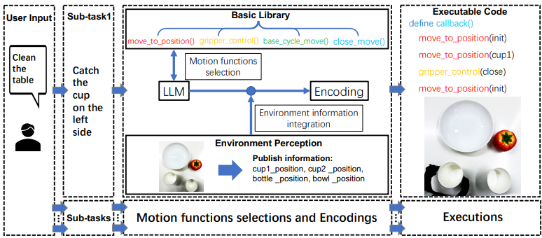 - 기본 라이브러리: 이 라이브러리는 사전 프로그래밍된 동작 함수들을 포함하고 있습니다. LLM은 작업 요구 사항에 따라 동작 함수를 선택하고 이를 환경 정보와 결합하여 Python 코드로 생성합니다. 이 코드는 로봇이 작업에 해당하는 동작을 수행하도록 제어합니다.