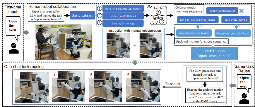 - 사용자는 로봇의 동작을 텔레오퍼레이션으로 수정하고, 수정된 동작은 DMP(Dynamic Movement Primitive) 라이브러리에 저장되어 나중에 재사용됩니다.