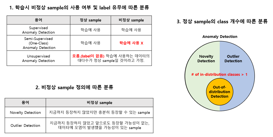 (1) 학습 시 비정상 샘플 사용 여부 & 라벨 유무
