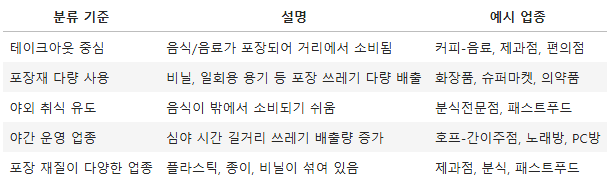 각각 거리소비성과 포장재다양성, 야외취식성등을 고려하여 길거리 쓰래기 발생 확률이 높은 업종을 총점으로 정량