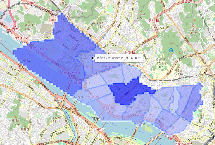 - Folium 지도로 시각화 (진한 파랑 → 낮은 기여값, 연한 파랑 → 높은 기여값)