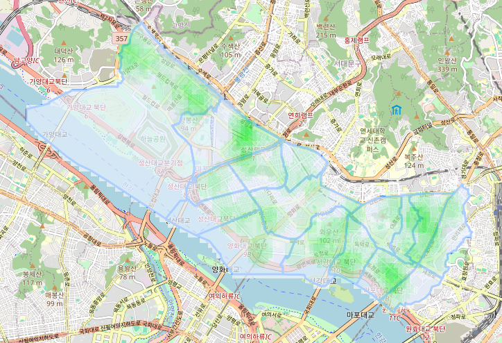 - 공원의 위치를 기준으로 인근 격자에 거리 기반 영향력을 계산. 거리 기반 확산(Gaussian)을 통해, 가까운 격자일수록 높은 영향력을 부여