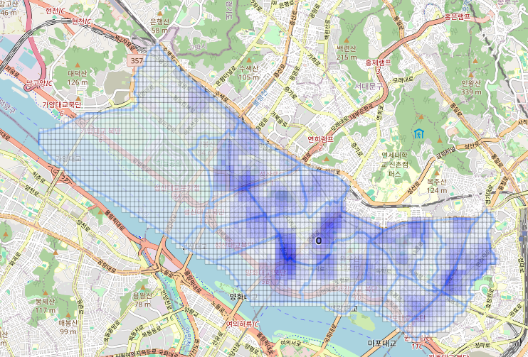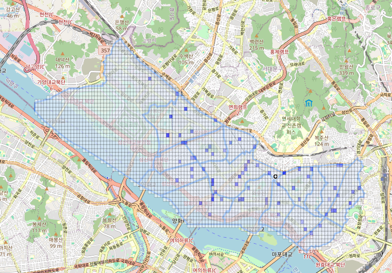 - 마포구 전체 영역을 기준으로 약 100m 간격의 격자(Grid) 를 생성