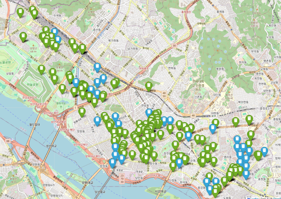 # 재배치된 쓰레기통 시각화 → 기본 초록 마커