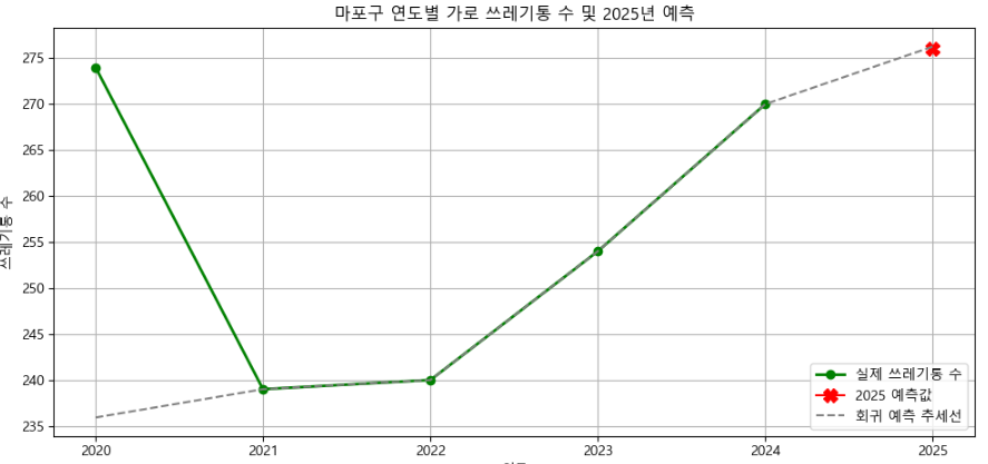 - 표준화 및 회귀분석을 통해 도출된 결과를 기반으로, 2025년에 필요한 쓰레기통의 수를 의미있는 값으로 예측함