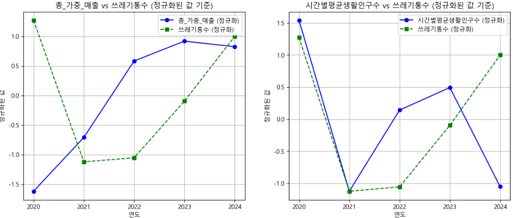 - 마포구 공공 데이터를 바탕으로, 생활인구, 상권 매출, 연간 쓰레기 배출량의 변화를 분석하여 쓰레기통 수요를 추정