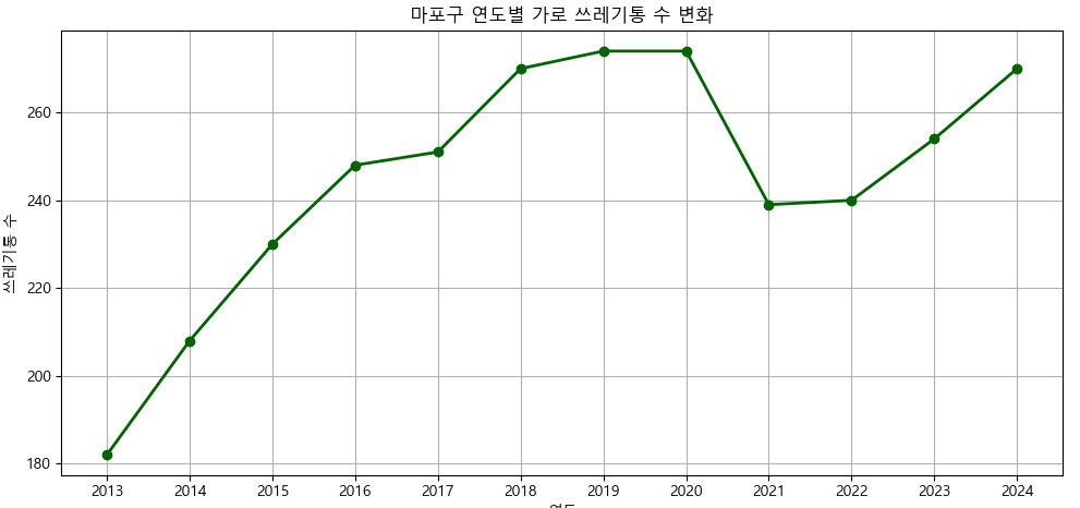 1. 마포구 연도별 가로 쓰레기통 변화 분석