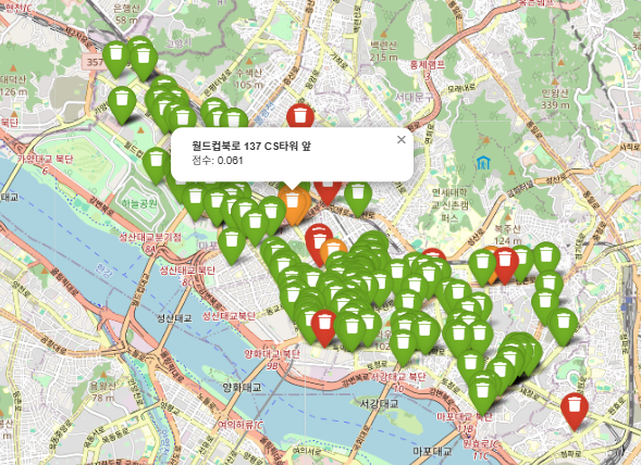 - 이러한 예측값을 바탕으로, 쓰레기통이 실제로 필요한 곳에 효율적으로 배치되도록 최적화하는 데 중점을 두었음음