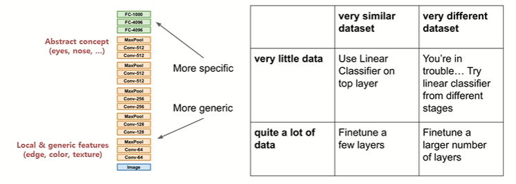 - 데이터가 적을 경우: 최대한 많은 부분을 Freeze하고, Classifier만 학습.