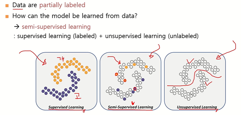 - Unsupervised Learning: 라벨이 전혀 없는 경우 비지도 학습.